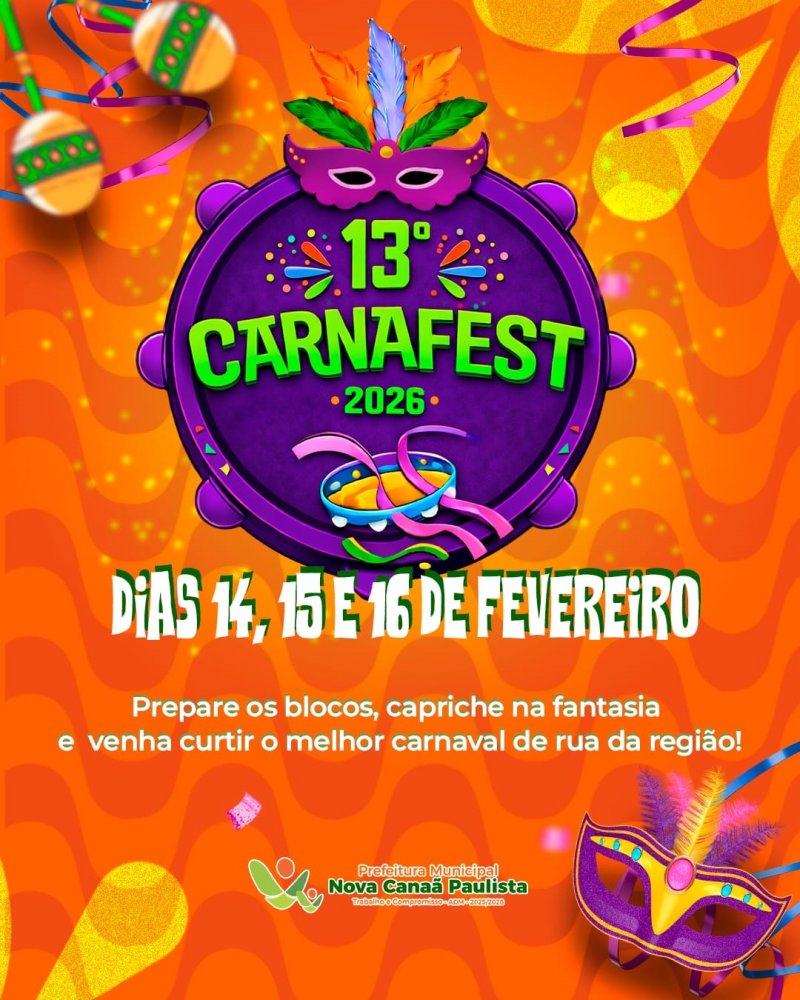 A tradição do Carnaval de Rua segue viva em Nova Canaã Paulista. Nos dias 14, 15 e 16 de fevereiro, o município será palco do 13º CarnaFest 2026, evento que promete reunir moradores e visitantes em três noites de muita festa, animação e diversão para todas as idades.