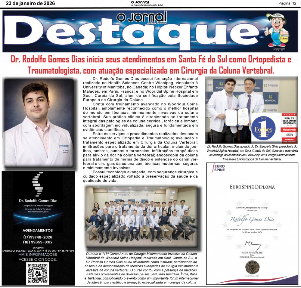 Dr. Rodolfo Gomes Dias possui formação internacional realizada no Health Sciences Centre Winnipeg, vinculado à University of Manitoba, no Canadá; no Hôpital Necker Enfants Malades, em Paris, França; e no Wooridul Spine Hospital em Seul, Coreia do Sul, além de certificação pela Sociedade Europeia de Cirurgia da Coluna.