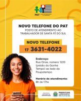 PAT DE SANTA FÉ DO SUL DIVULGA NOVO TELEFONE DE ATENDIMENTO AO PÚBLICO