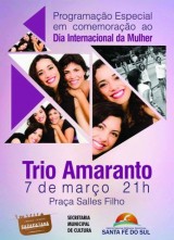 Hoje, a partir das 20:00 horas, haverá em Santa Fé, na Praça Salles Filho, um show com o Trio Amaranto. A apresentação será realizada através da Secretaria Municipal de Cultura, em parceria com o Conselho Municipal da Mulher, em comemoração ao Dia Internacional da Mulher. As mulheres presentes receberão um cupom para concorrem a uma ... leia mais