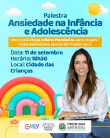 A Prefeitura da Estância Turística de Santa Fé do Sul, por meio da Secretaria Municipal de Cultura e Turismo, promoverá na quinta-feira da próxima semana (11) a palestra “Ansiedade na Infância e Adolescência”, voltada para pais e responsáveis dos alunos do Projeto Guri. O encontro será ministrado pela psicóloga Juliana Mandarim, a partir das 18h30, ... leia mais